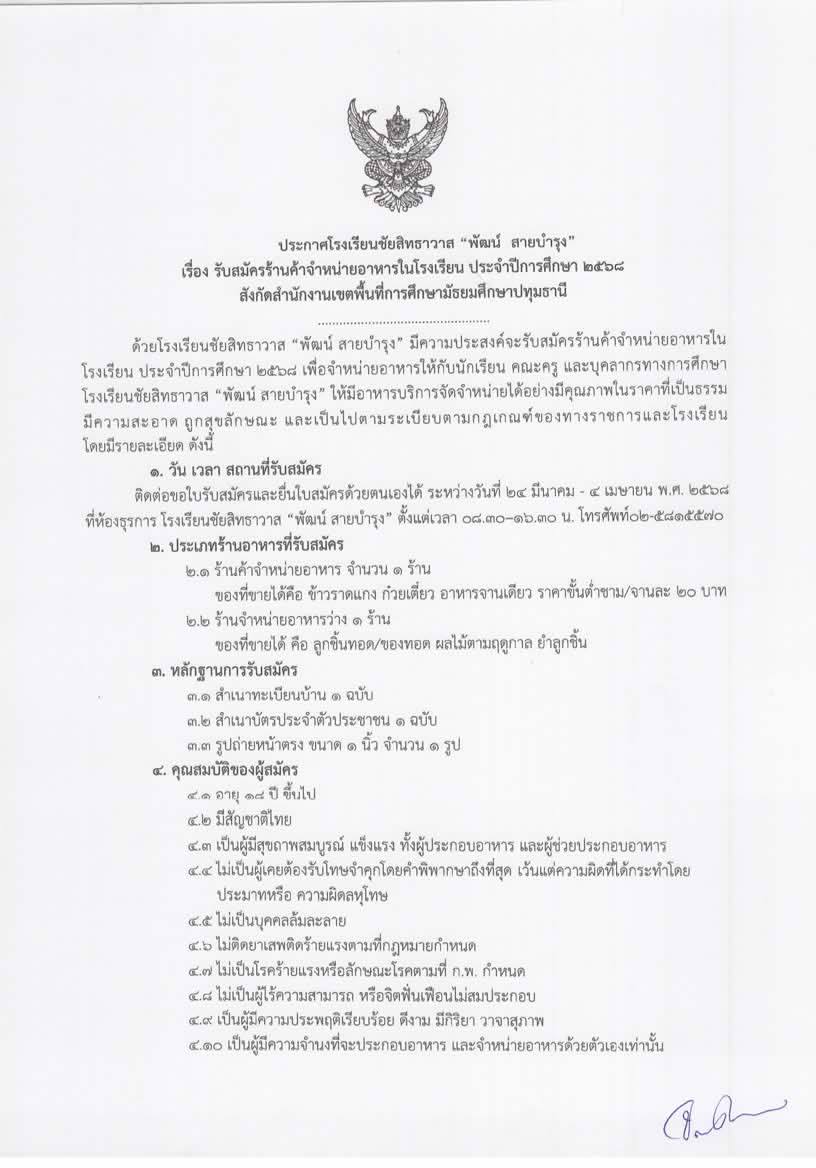 ประกาศรับสมัครร้านค้าจำหน่ายอาหารในโรงเรียนประจำปีการศึกษา 2568