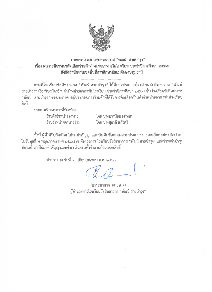 ประกาศ ผลการพิจารณาคัดเลือกร้านค้าจำหน่ายอาหารในโรงเรียน ประจำปีการศึกษา 2568